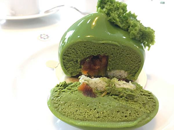 不怎麼起眼的「在樹上唱歌」其實是"稻町森法式甜點"的常設性甜點。蛋糕內陷用的是台灣在地小農之新竹新埔的「柿餅」混合著小山園若竹的抹茶榛果奶油餡,整個蛋糕是綠的發亮。