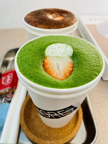 關於「抹茶拿鐵 & 經典可可」:店裡的抹茶拿鐵(牛奶)與經典可可當拿上來時,很開心各放了一小塊草莓,立刻柔軟內心,角落設計感十足的佈置,非常與眾不同!